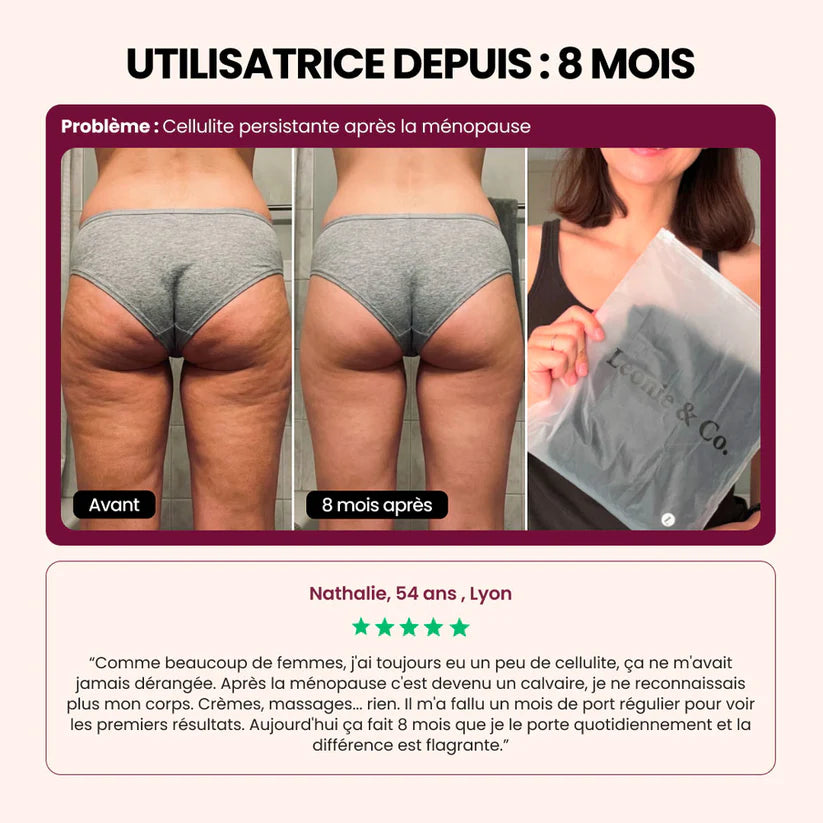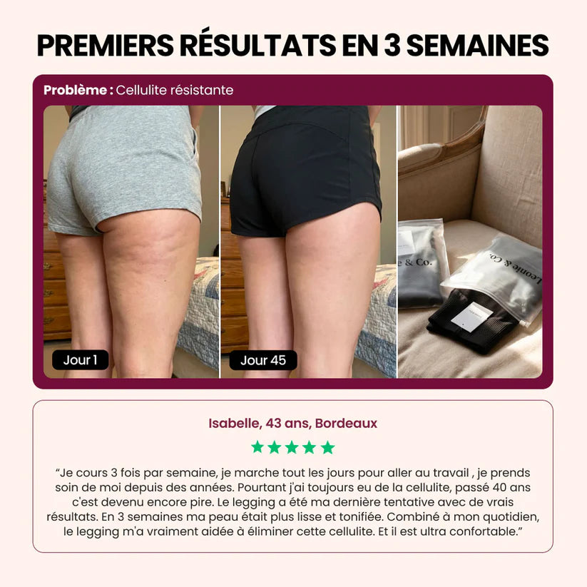 « J’étais sceptique avant de commander, mais après 2 mois d’utilisation avec le legging 3D de chez Leonie and Co, en le portant 2 heures par jour, ma peau est devenue beaucoup plus lisse et j’ai enfin repris confiance en moi ! »